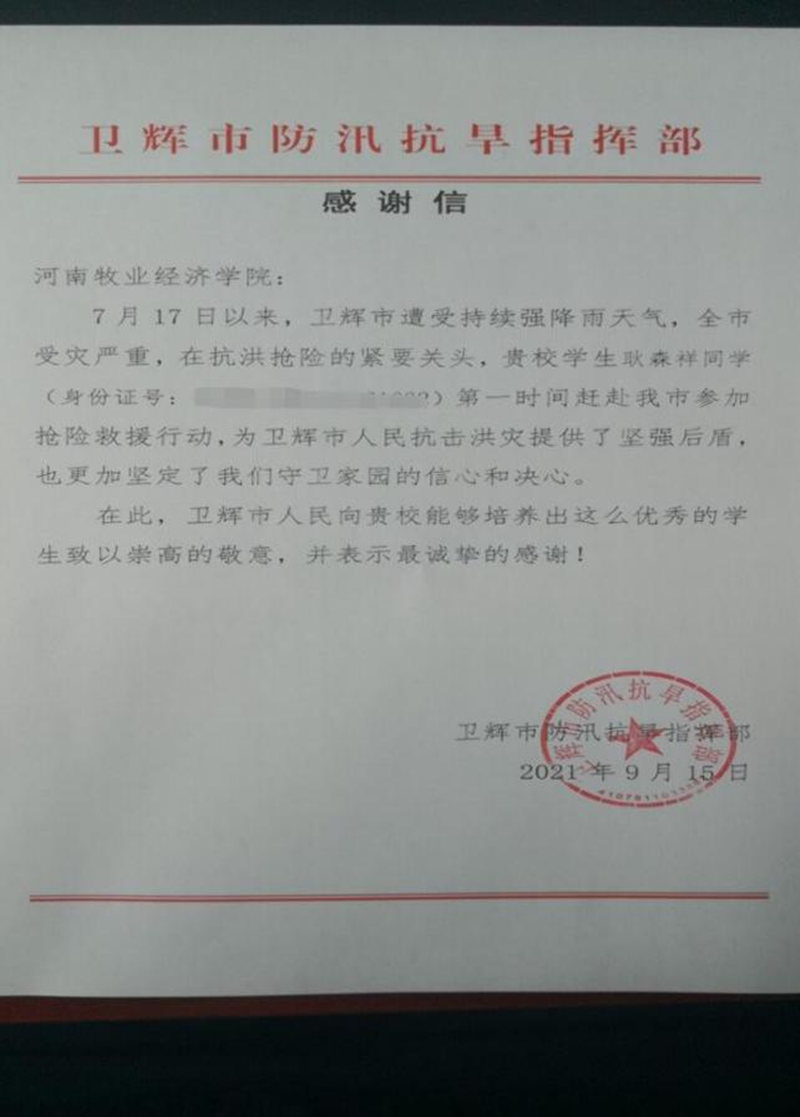 公司耿森祥同学以实际行动践行志愿精神,投身到这场防汛救灾中,他的出色表现得到了卫辉市防汛抗旱指挥部的感谢,充分彰显了老员工的爱心善意和责任担当。